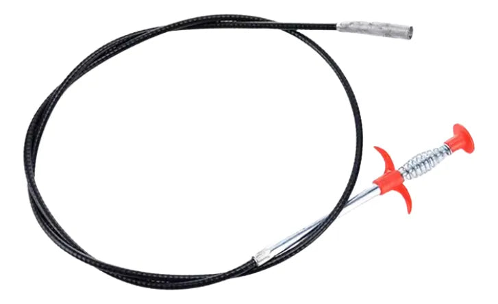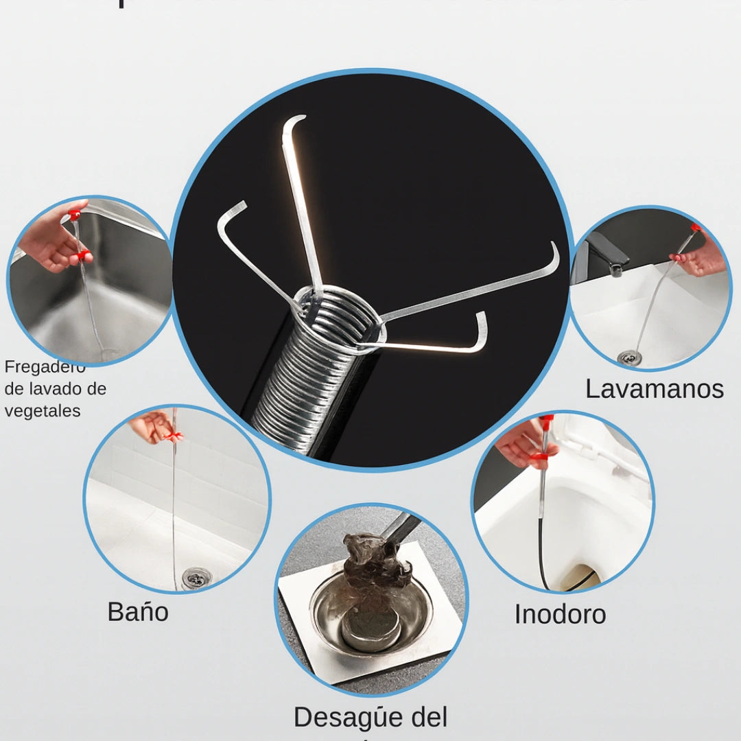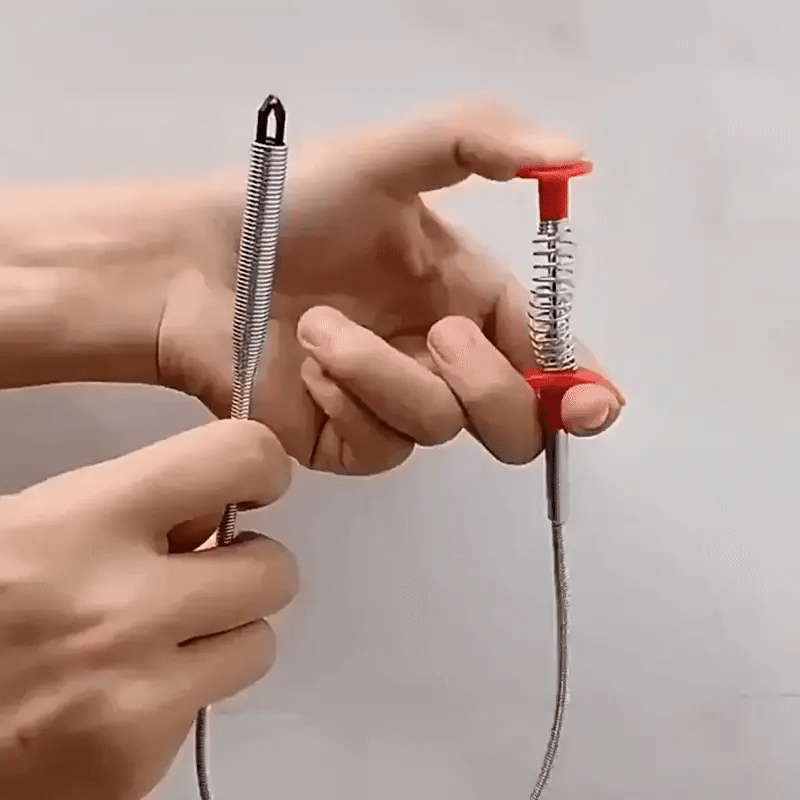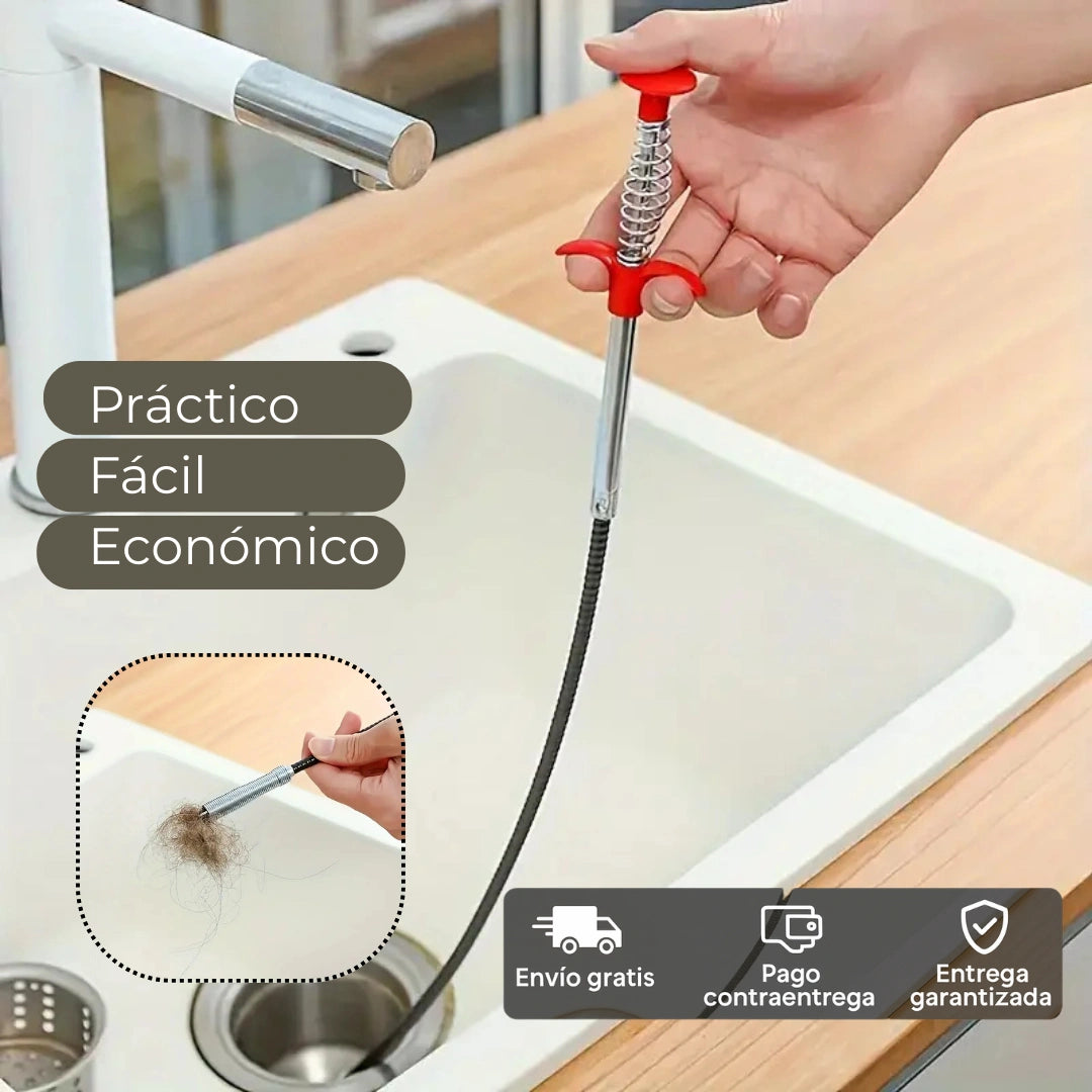 Introduces el cable flexible en el desagüe, aprietas el mango y la garra metálica agarra pelos, mugre o residuos que obstruyen.