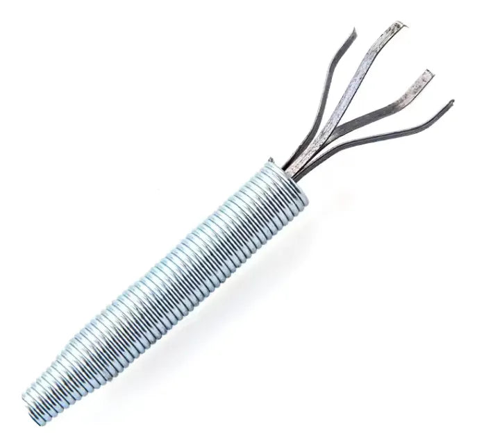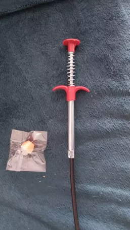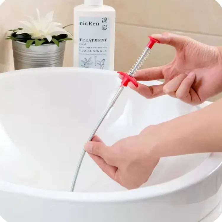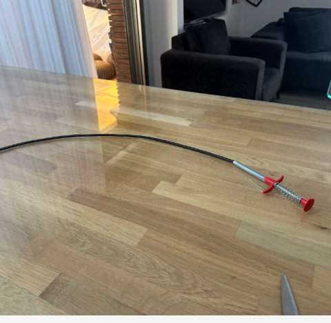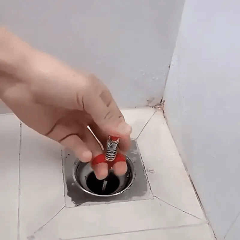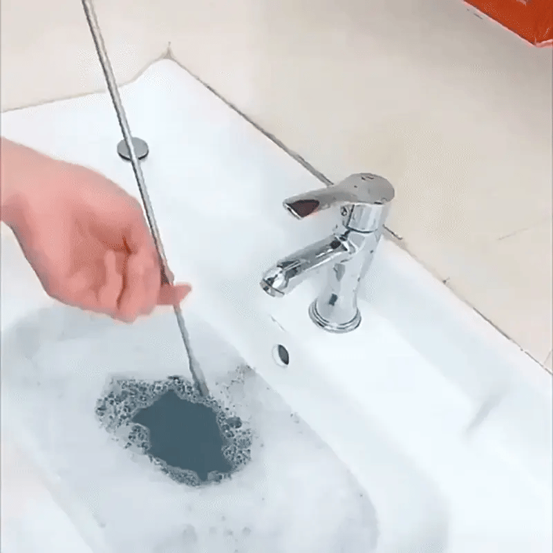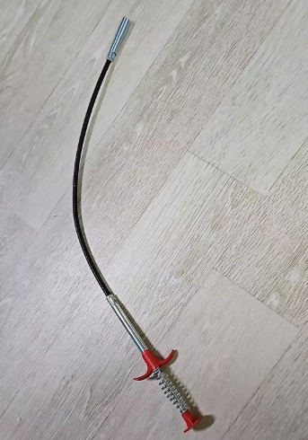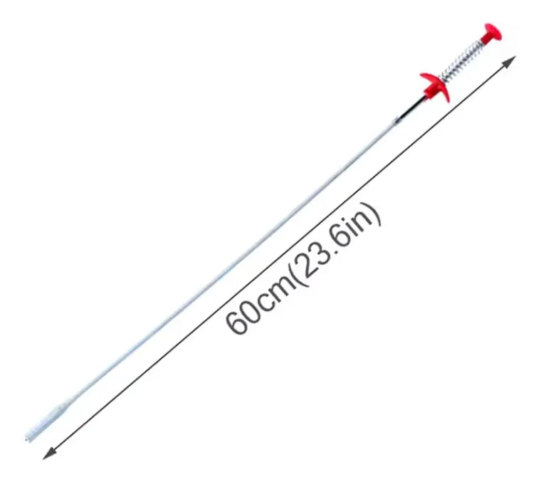 Introduces el cable flexible en el desagüe, aprietas el mango y la garra metálica agarra pelos, mugre o residuos que obstruyen.