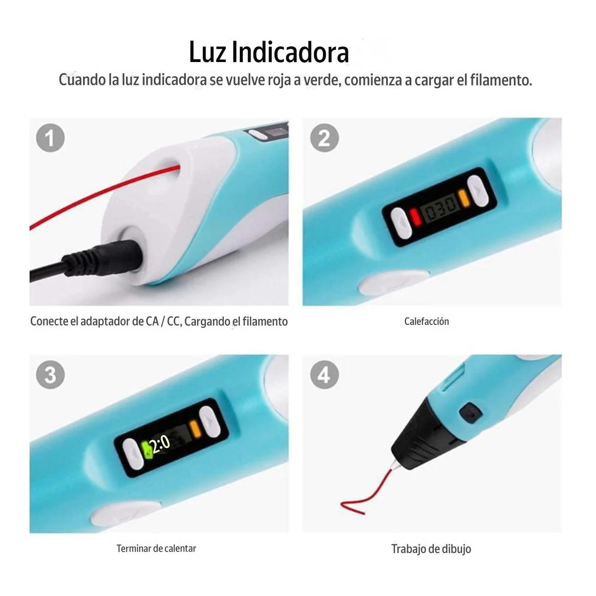 Solo conecta el lápiz al adaptador, inserta el filamento por la parte trasera y ajusta la temperatura en la pantalla LCD.