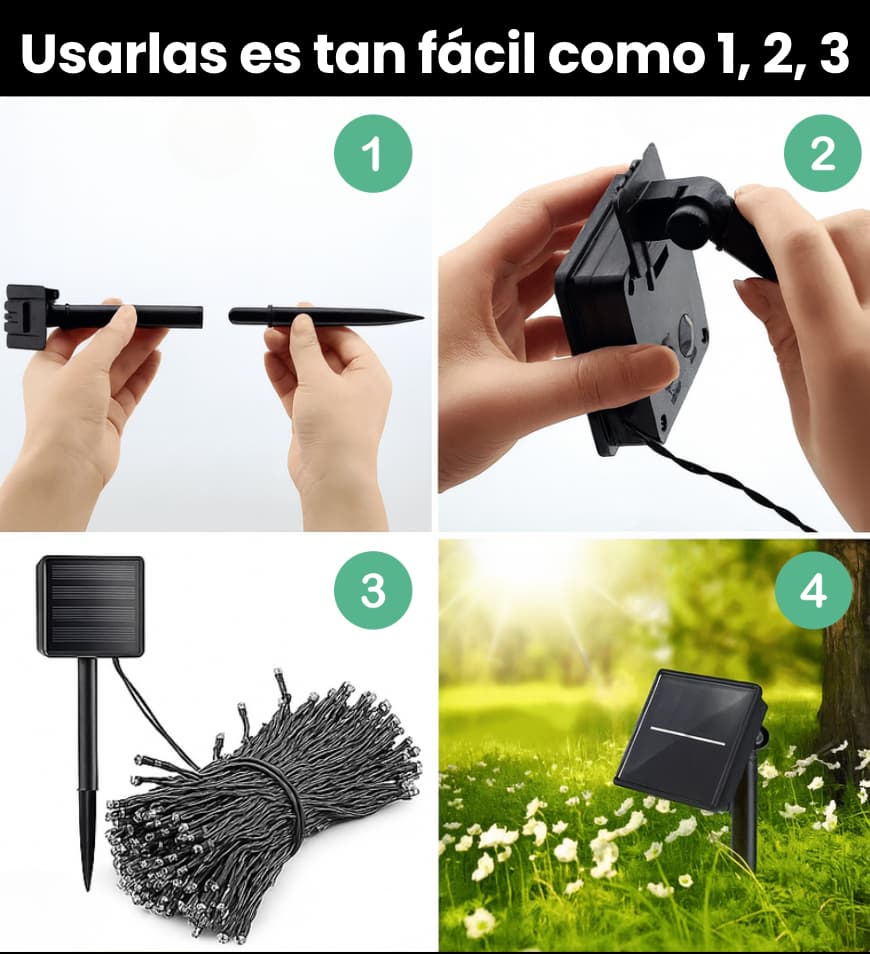 ¡Es muy fácil! Clava la estaca del panel solar en el suelo/maceta, oriéntala al sol, coloca las luces y enciende el interruptor a "ON". No necesita herramientas..